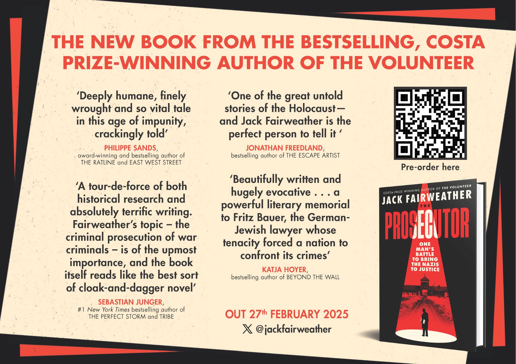 Jack Fairweather is an award-winning and bestselling British writer and journalist. His last book, The Volunteer , won the Costa Book Prize, and was a #1 Sunday Times bestseller, hailed as a modern classic, and compared to Schindler’s List. His newest release, The Prosecutor, will be the subject of this book talk.