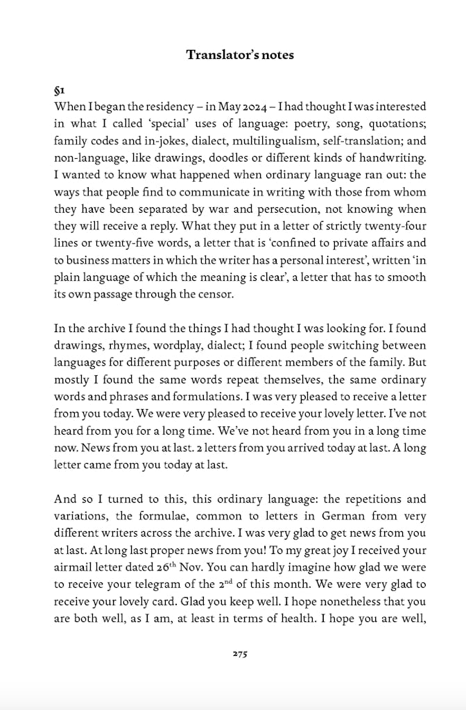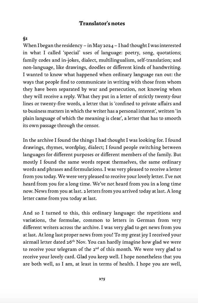 Conversation Time is a collection of translations from letters written between 1938 and 1945 by refugees from and victims of the Nazi genocide. The selection focuses on greetings, formulae, writing about writing—the ordinary and repeated phrases that people used to express themselves to friends and family members from whom they were separated, not knowing when or if they would receive a reply. Stories of displacement and persecution, anxiety and longing are communicated indirectly, pressing through from behind the written repetitions and everyday language, visible to us through the letters’ dates. Conversation Time addresses the challenges of translating these letters now – how to convey their ordinariness, what it means to be a human translator in an age of machines, and how to let resonances between the letters, and between the letters and the present, sound out.