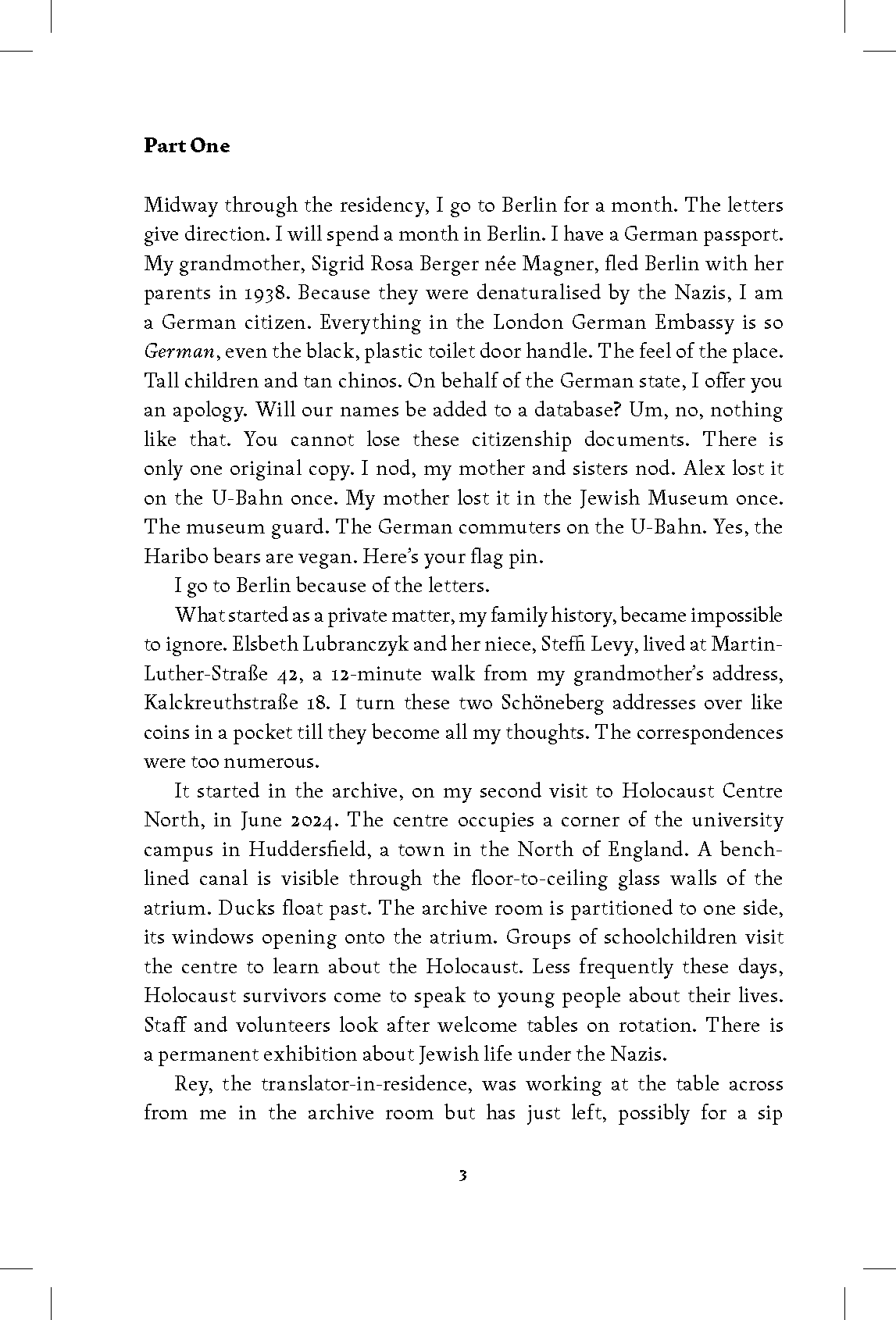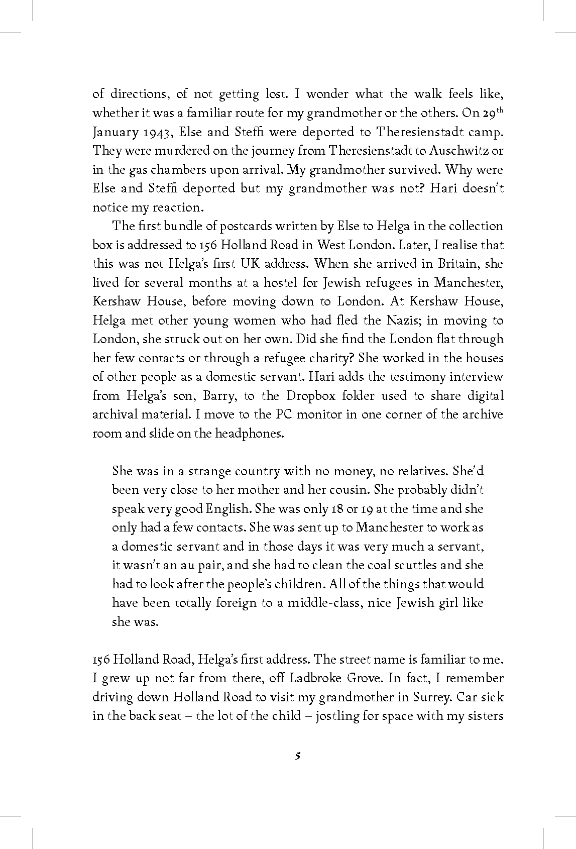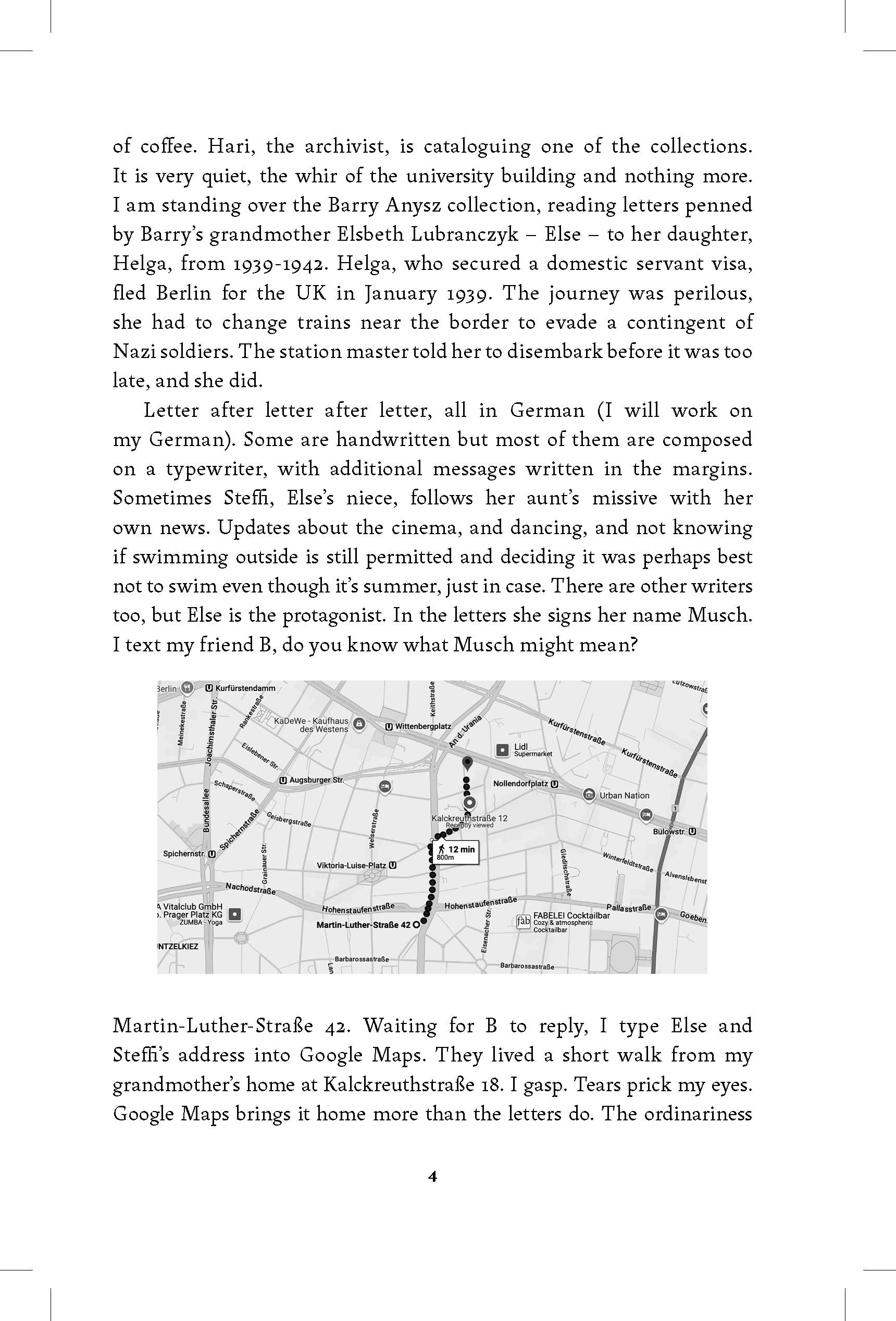 When Tom Hastings discovers that his grandmother lived a short walk from Else Lubranczyk, a middle-class Jewish seamstress whose letters are kept in the Holocaust Centre North Archive, he travels to Berlin. Else’s letters to her refugee daughter, Helga, tell a story of ordinary life in Schöneberg; of recriminations, fantasies of reunion, and thwarted attempts to get out. But where the author’s grandmother fled, Else and her niece, Steffi Levy, were deported to Theresienstadt in 1943.